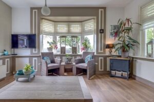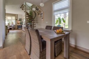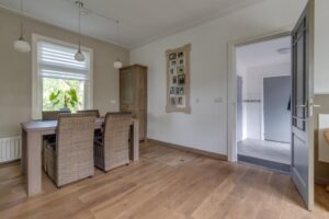 Indeling: Hal, meterkast, L-vormige woonkamer met trapopgang, half open keuken met moderne inrichting, achterhal met plavuizenvloer, toilet, luxe geheel betegelde badkamer met ligbad, ruime inloopdouche, wastafelmeubel en sauna (!), stookruimte, wasruimte. De begane grond is voorzien van houten vloerdelen.