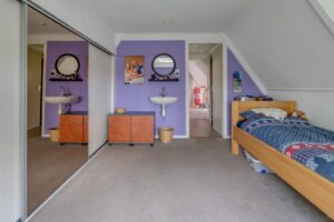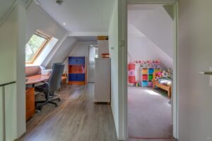 1e Verdieping: Royale overloop met dakkapel, kastruimte en werkhoek voorzien van dakraam, slaapkamer met schuifwandkast, slaapkamer met dakraam en vaste kast, slaapkamer met dakraam, kastenwand en deur naar loggia. De verdieping is voorzien van laminaatvloer.