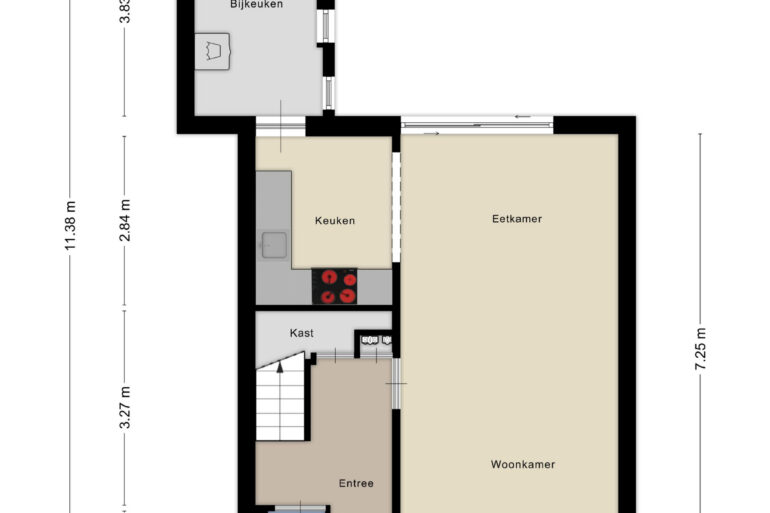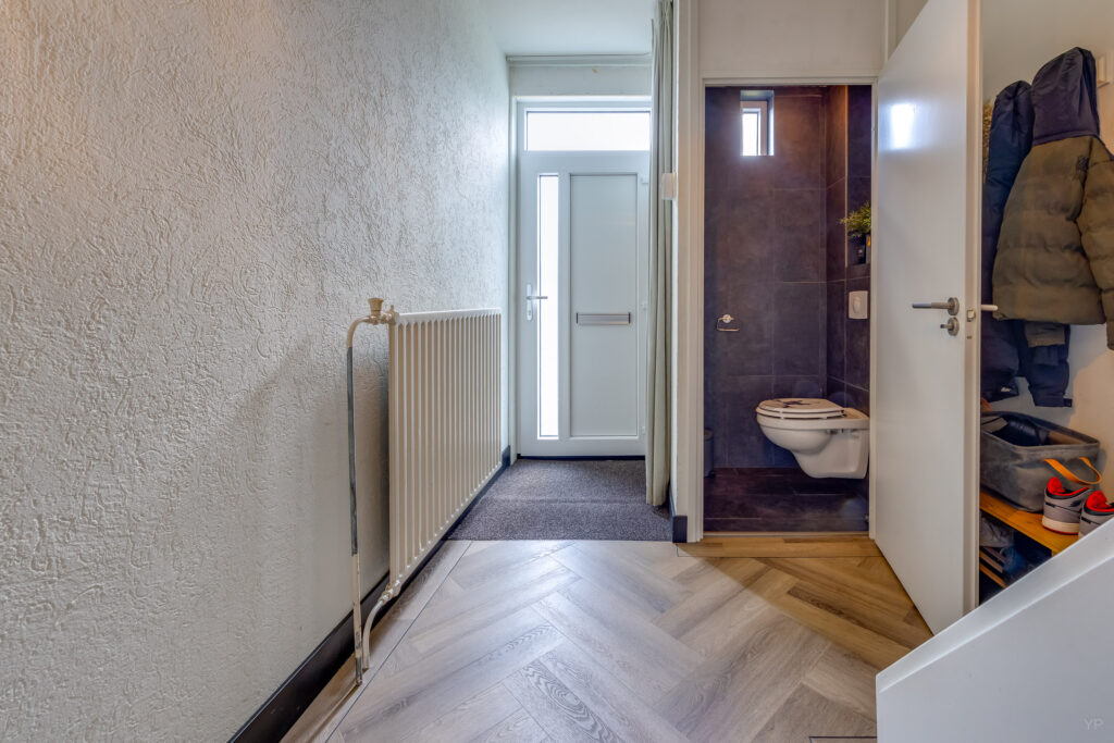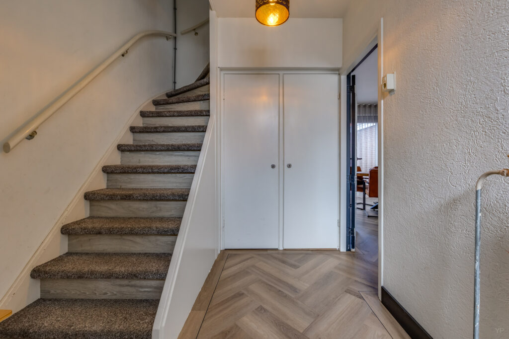 Indeling: Hal/entree, provisiekast, meterkast, modern geheel betegeld toilet, trapkast, woonkamer met schuifpui, moderne half open keuken, bijkeuken voorzien van keukenblok en wasmachineaansluiting. De begane grond is voorzien van een mooie visgraat PVC-vloer.