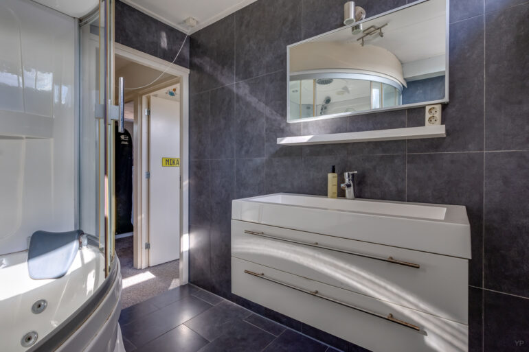 Eerste verdieping: Overloop, 3 ruime slaapkamers, geheel betegelde badkamer voorzien van whirlpool/douchecabine, 2e toilet en wastafelmeubel.