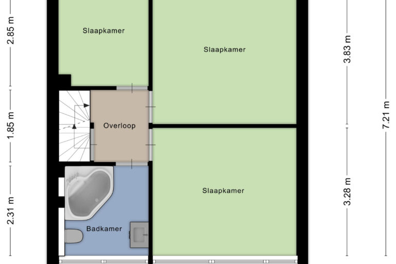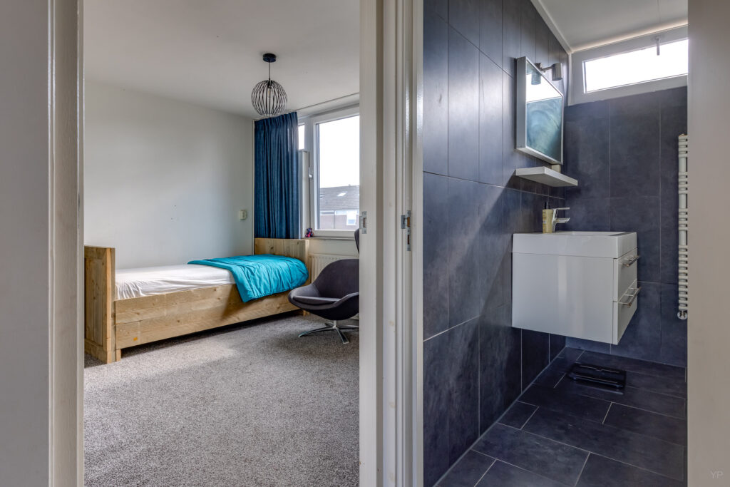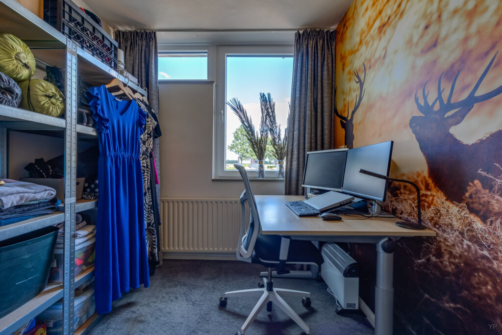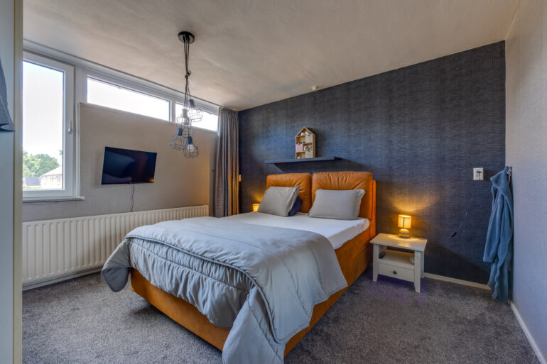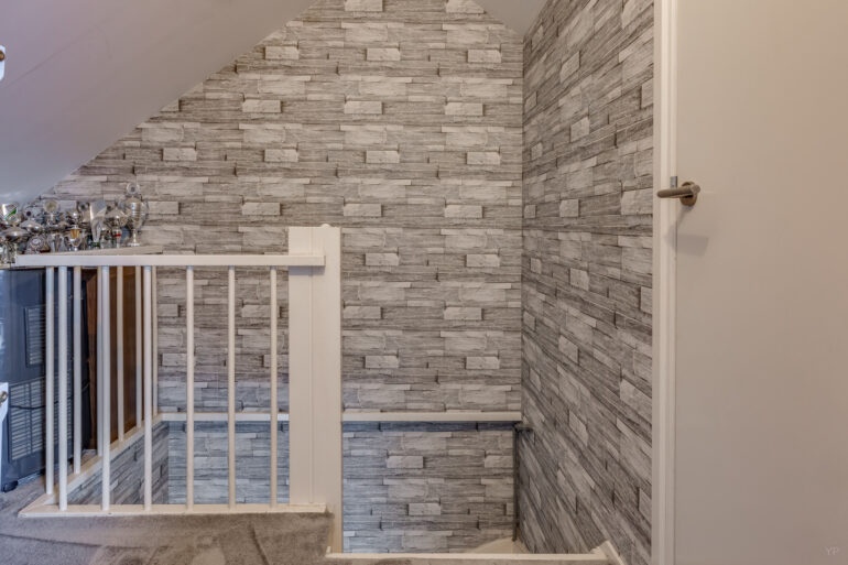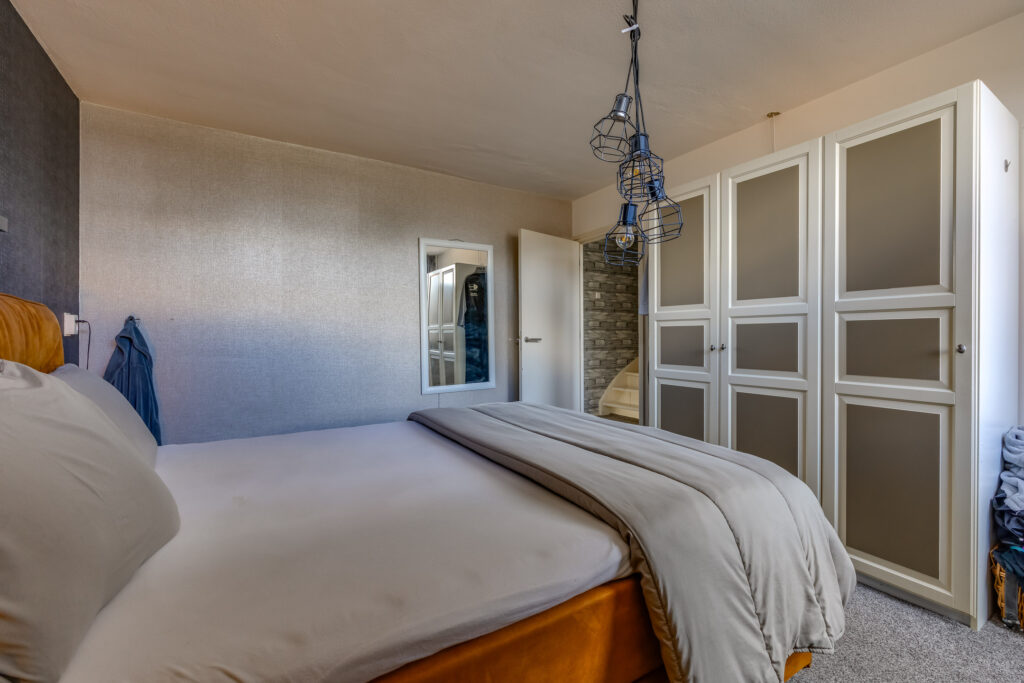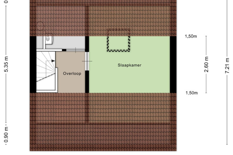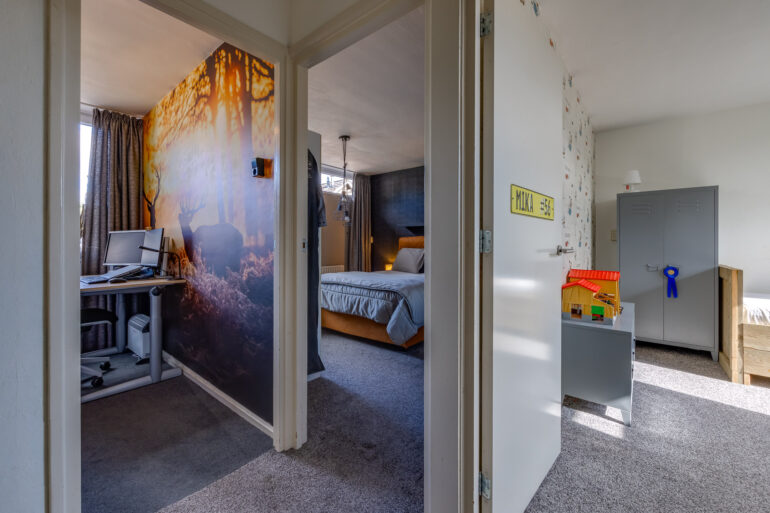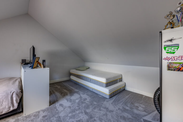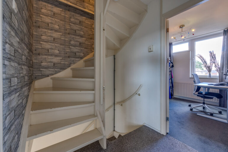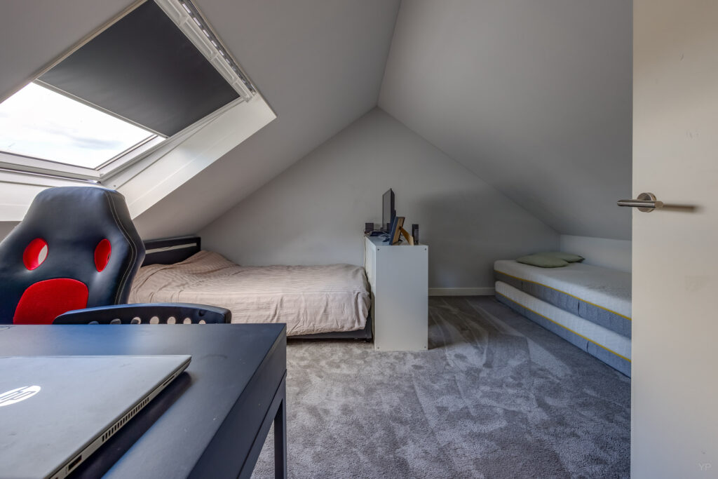 Vaste trap naar tweede verdieping met overloop, 4e slaapkamer voorzien van een nieuw dakraam (2025) en stookruimte.