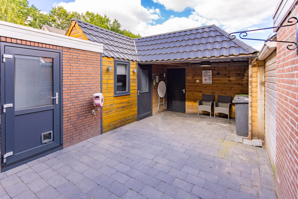 De besloten tuin is gelegen op het noordoosten en is voorzien van een houten schuurtje ca. 9 m2 en een overkapping van ca. 8 m2.