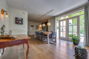 Indeling: Hal met trapopgang, meterkast, Z-vormige lichte woonkamer met gashaard, openslaande tuindeuren en houten vloerdelen, royale woonkeuken (ca. 48m2) met tuindeur (2x), houten vloerdelen en landelijke keukeninrichting, provisiekelder, tussenhal met trapopgang, slaapkamer met inloopkast, wellness ruimte met sauna, douche en wastafelmeubel, bijkeuken, toilet met wandcloset en urinoir.