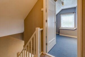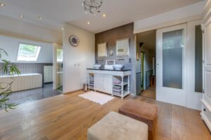 1e Verdieping: Overloop, slaapkamer met vaste kasten, slaapkamer met dakkapel en vaste kasten, ruime bad-/kleedruimte voorzien van ligbad, douche, dubbele wastafel en toilet, 2e overloop, 2 slaapkamers (elk ca.14m2) met dakraam en kastruimte.