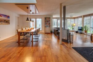 De begane grond is voorzien van een parketvloer, in de keuken en bijkeuken ligt een plavuizenvloer.
