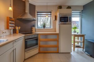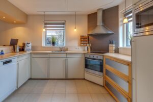 De U-vormige keukeninrichting is voorzien van een inbouwvaatwasser, inductie kookplaat, oven, afzuigkap, koelkast en combimagnetron.