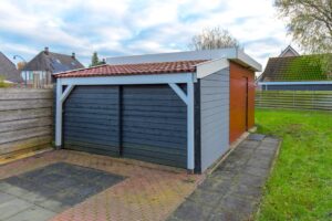In de tuin staat een houten schuur met een aangebouwde kleinere berging voor gereedschap en houtopslag.