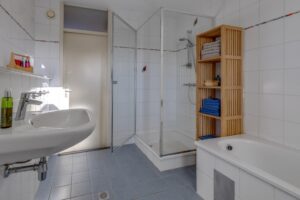 1e Verdieping: Overloop, 3 slaapkamers waarvan 1 met openslaande balkondeuren en schuifwandkast, geheel betegelde badkamer met ligbad, douchehoek (met nieuw douchescherm en deur), 2e wandcloset en wastafel.