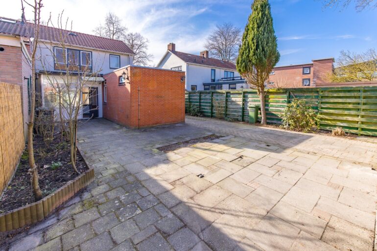 De diepe tuin is gelegen op het noordoosten en voorzien van een houten garage/schuur met elektrisch bedienbare kanteldeur. Naast de woning is de oprit gelegen die kan worden afgesloten met een toegangshek.