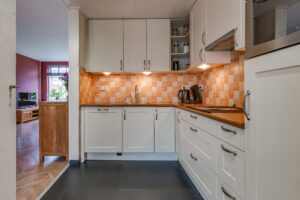 De keuken is voorzien van een inbouwvaatwasser, koelkast, combimagnetron, inductie kookplaat en afzuigkap.