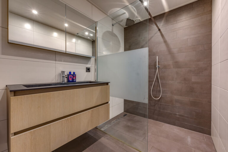 Eerste verdieping: Overloop, 4 slaapkamers voorzien van laminaatvloer, vergrote moderne badkamer voorzien van inloopdouche en wastafelmeubel.