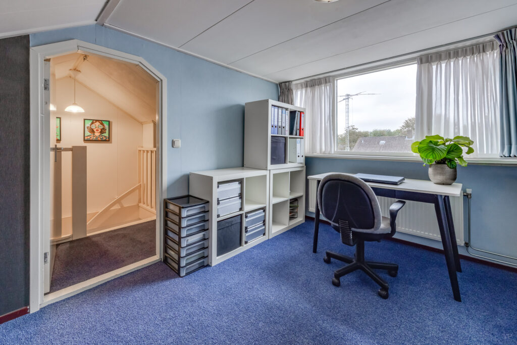 Vaste trap naar tweede verdieping met overloop, 5e slaap-/werkkamer met dakkapel, stookruimte.