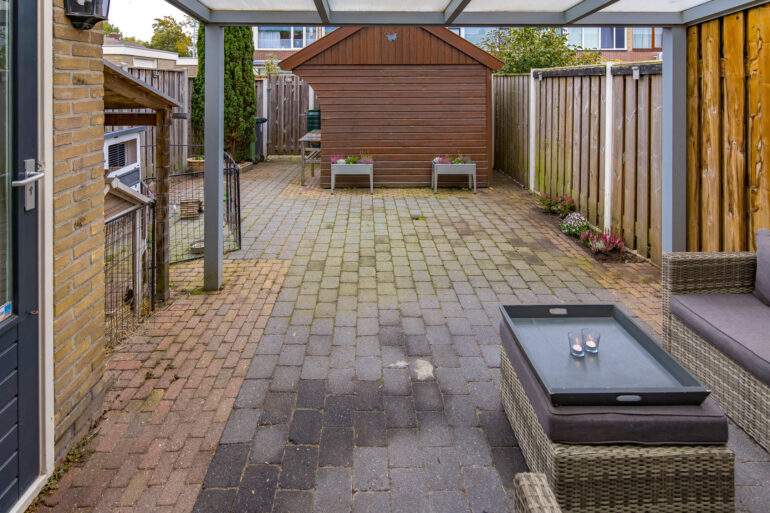 In de tuin staat een vrijstaand houten schuurtje. Er is een achterom aanwezig.