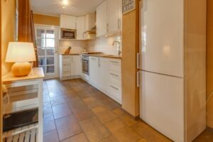 De keukeninrichting is voorzien van een inbouwvaatwasser, magnetron, oven, gasstel en afzuigkap.