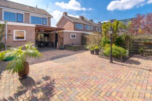 Aan rustig straatje, tegenover basisschool gelegen, moderne en onderhoudsvrije helft van dubbel woonhuis met uitbouw, bijkeuken, overkapping en verlengde garage op 274 m2 grond.