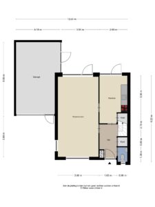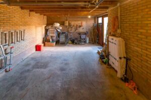De brede aangebouwde garage (3.70m x 6.85m) heeft naast de kanteldeur nog een loopdeur.