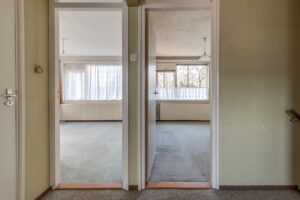 Indeling: Hal, meterkast, toilet, bergkast, eetkeuken, kelderkast, lichte woonkamer met tuindeur.