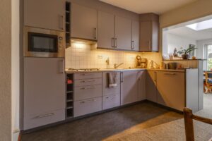 De keukeninrichting is voorzien van een inbouwvaatwasser, gasstel, afzuigkap, koelkast en combimagnetron.