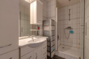 1e verdieping: Overloop, 4 slaapkamers, geheel betegelde badkamer met douchehoek en wastafelmeubel.