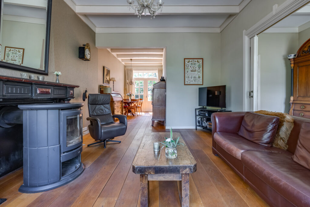 De woonkamer en de tuinkamer hebben een houtkachel (ter overname).