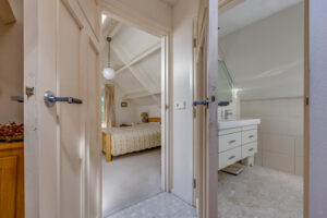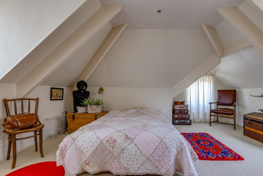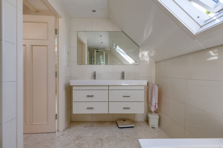 1e Verdieping: Overloop met schuifwandkasten, slaapkamer met 2 dakkapellen en balkon, slaapkamer, 2e overloop met dakraam, geheel betegelde badkamer met dakraam en voorzien van ligbad, douchehoek, 2e wandcloset, dubbel wastafelmeubel, ruime slaapkamer met dakraam en deur naar balkon.