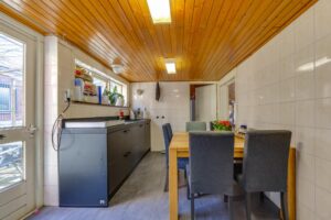 Indeling: Hal, meterkast, in verbouw zijnde royale woonkamer met keukenruimte (totaal ca. 80m2), toiletruimte, wasruimte, dichte keuken met modern keukenblok, werk-/slaapkamer (thans in gebruik als tijdelijke woonkamer, bijkeuken, badkamer voorzien van een douchehoek, 2e toilet en wastafel. Aangebouwde geheel betegelde bergruimte.