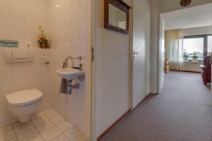 Hal, meterkast, ruime lichte woonkamer met open keuken en schuifdeur naar balkon, toilet, bijkeuken, 2 slaapkamers waarvan 1 met schuifwandkast, geheel betegelde badkamer met douchehoek en wastafel.