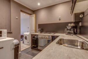 De keukeninrichting is voorzien van een 5-pits gasstel en oven.