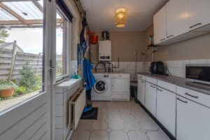 Indeling: Hal, meterkast, half betegeld toilet met fonteintje, kelderkast, ruime woonkamer, half open keuken met ruime keukenopstelling, bijkeuken met plavuizenvloer en extra keukenblok.