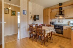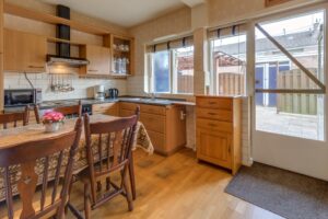 De keuken is voorzien van een inbouwkoelkast, kookplaat, oven en afzuigkap.
