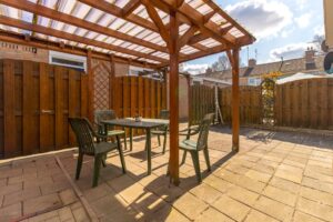 De achtertuin is op het zuidoosten gelegen. In de tuin staat een overkapping en achter het appartement is een stenen schuur gelegen.