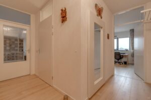 Indeling: Hal, meterkast, toilet (wandcloset), zeer ruime en lichte zonnige woonkamer met frans balkon en open keuken (waardoor veel lichtinval!) met deur naar balkon (ca. 12m2) met werkkast, bijkeuken met stookruimte, 2 vergelijkbare ruime slaapkamers (beiden ca. 13m2) waarvan 1 met deur naar balkon en 1 voorzien van een schuifwandkast, geheel betegelde badkamer met ruime douchehoek en wastafelmeubel.