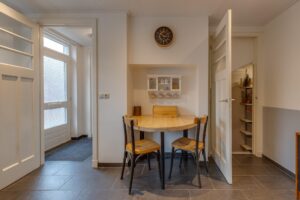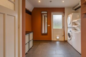 Indeling: Hal, meterkast, ruime woonkamer met houtkachel, woonkeuken met moderne keukeninrichting, kelderkast, bijkeuken, geheel betegeld modern toilet, geheel betegelde badkamer met douchehoek en wastafelmeubel. De begane grond is voorzien van vloerverwarming met een plavuizenvloer.