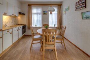 De keukeninrichting is voorzien van een inbouwgasstel, koelkast, oven en afzuigkap.