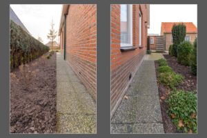 Het gehele perceel is 300m2 groot incl. woning en garage, er is geen achtertuin aanwezig, wel een terras en een ruime oprit voor meerdere auto’s.